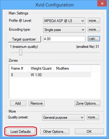 takodje mozes da aktiviras "Load Defaults" kako bi XviD kodek vratio podrazumevana podesavanja :