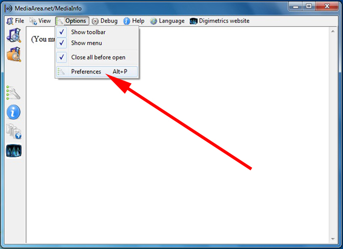 Otvara se pocetni prozor MediaInfo.Aktivirajte karticu-Options-i u padajuci meni pritisnite-Preferences-kao sto pokazuje strelica :
